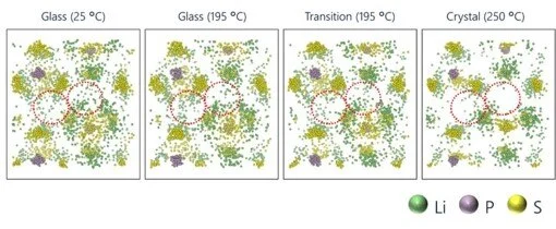 When Li₃PS₄ is heated and the atomic distribution is examined in each of the glass, transition, and crystalline states, it is suggested that Li is diffused in the glass state resulting in high electrical conductivity, while Li is aggregated in the crystalline state resulting in low electrical conductivity.