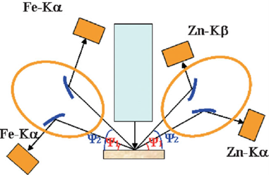 本発明は、従来よりも正確にめっき層の付着量と組成を分析できる蛍光X線分析技術です。測定深さ※1の違いによる影響を少なくするため、入射角と取出角の異なる2つの光学系を用い、めっき層の全ての深さを分析対象としました。これにより、めっき層全体の組成情報に基づく正確な分析が可能となりました。本発明は、自動車の車体などに用いられる合金化溶融亜鉛めっき鋼板の品質管理に大きく貢献しています。