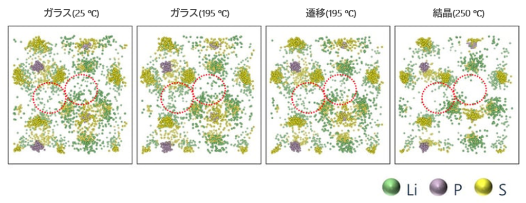 Li3PS4を加熱してガラス、遷移、結晶それぞれの状態における原子の分布を見ると、ガラス状態ではLiが拡散していることから電気伝導が高く、結晶状態ではLiが凝集していることから電気伝導が低いことが示唆されます。これは電気伝導の実験結果からも同様の傾向が見られます。