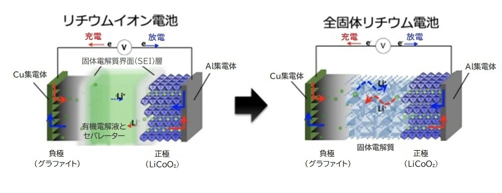 一般的に普及しているLIBに使用される電解質は有機溶媒系の液体であり、伝導率が高いメリットがある一方で、液漏れや高温化による発火、さらに氷点下での性能低下というデメリットもあります。これらの欠点を克服するために、LIBの電解質に、液体の代わりに固体を使用した”全固体電池”が、各研究機関で実用化に向けて盛んに研究されています。